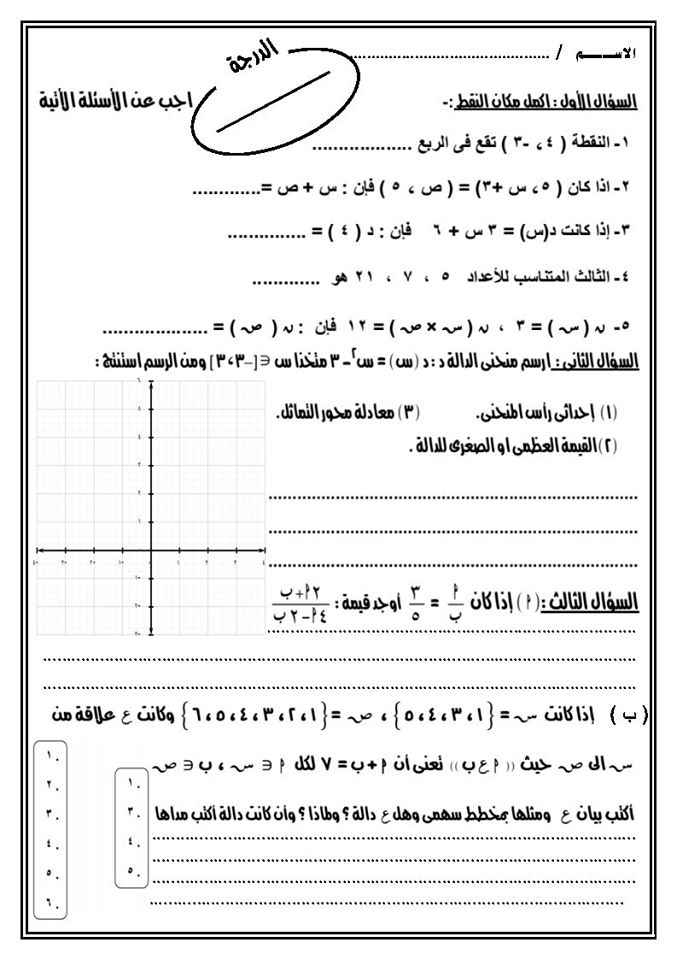 امتحان جبر للصف الثالث الاعدادى الترم الاول 2020