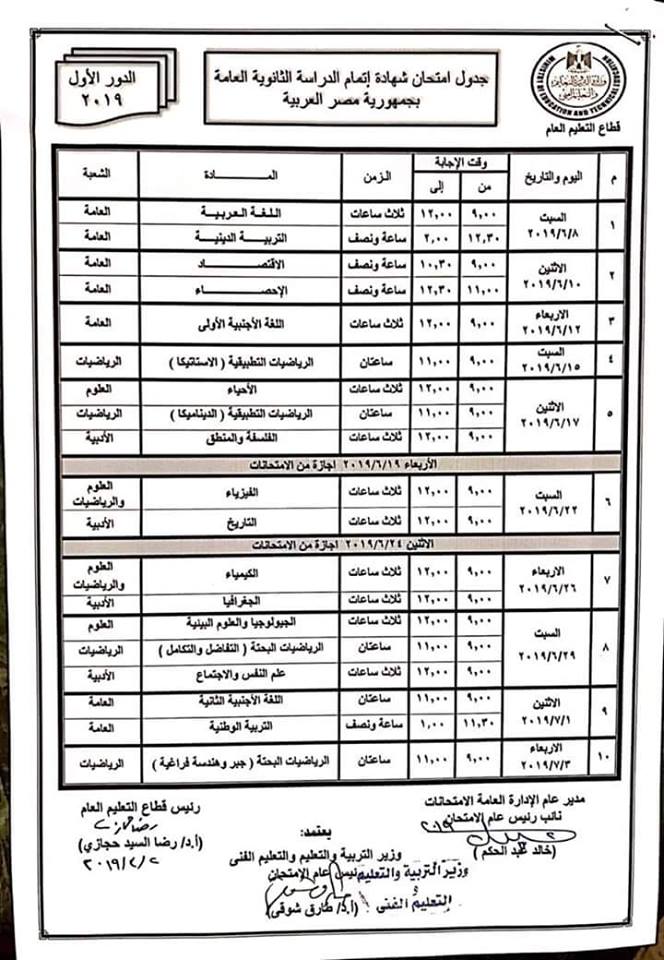 أحصل على جدول امتحانات الثانوية العامة 2019 العلمي والأدبي بالصور