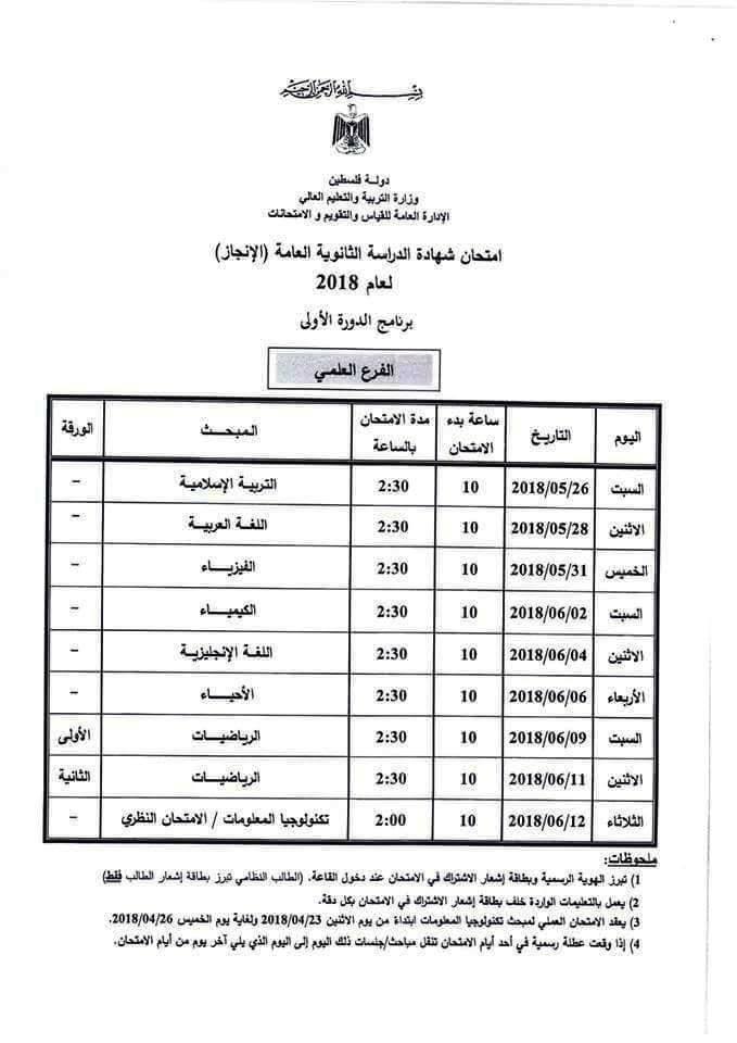 جدول امتحانات الثانوية العامة 2020 فلسطين لم يسبق له مثيل الصور