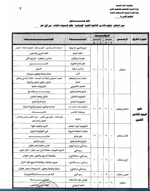 جدول التعليم الفني الصناعي نظام الثلاث الصفحه الرسميه لطلاب