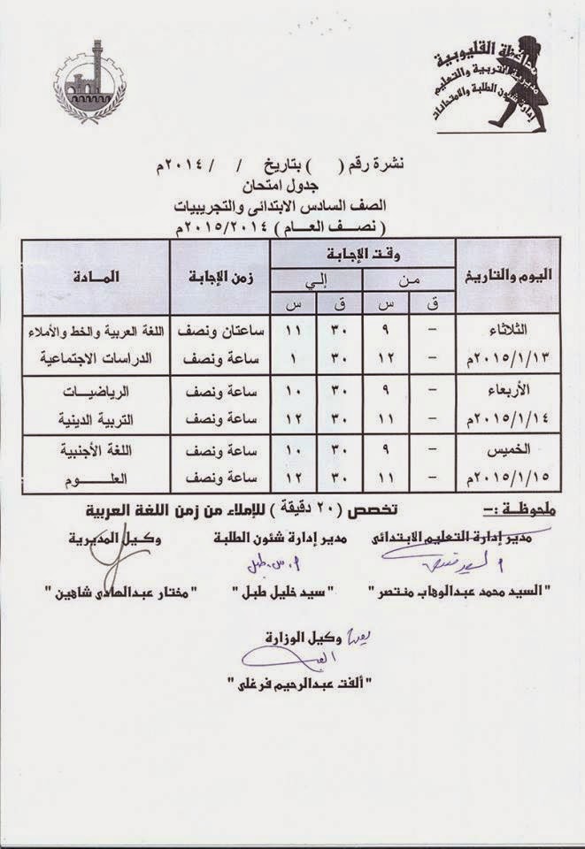 جدول امتحانات نصف العام 2016 محافظة القليوبية