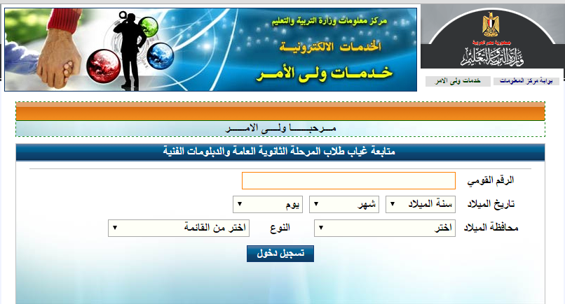 متابعة غياب الثانوية العامه والدبلومات بالرقم القومي خدمة ولي