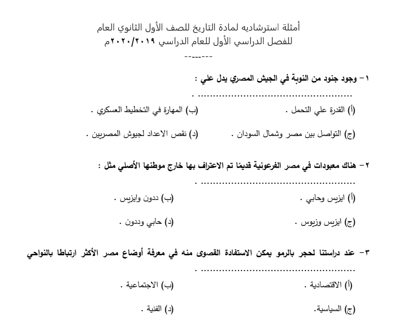 نموذج امتحان التاريخ للصف الثاني الثانوي الترم الأول 2019 2020