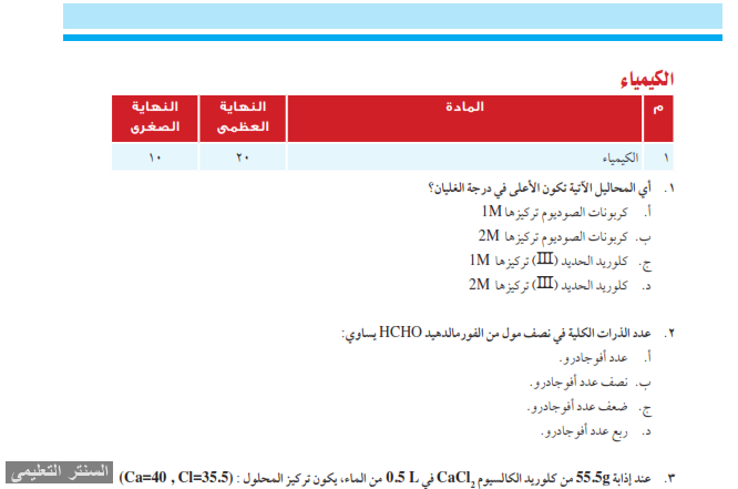 نموذج امتحان الكيمياء للصف الأول الثانوي الترم الأول 2020 اليوم