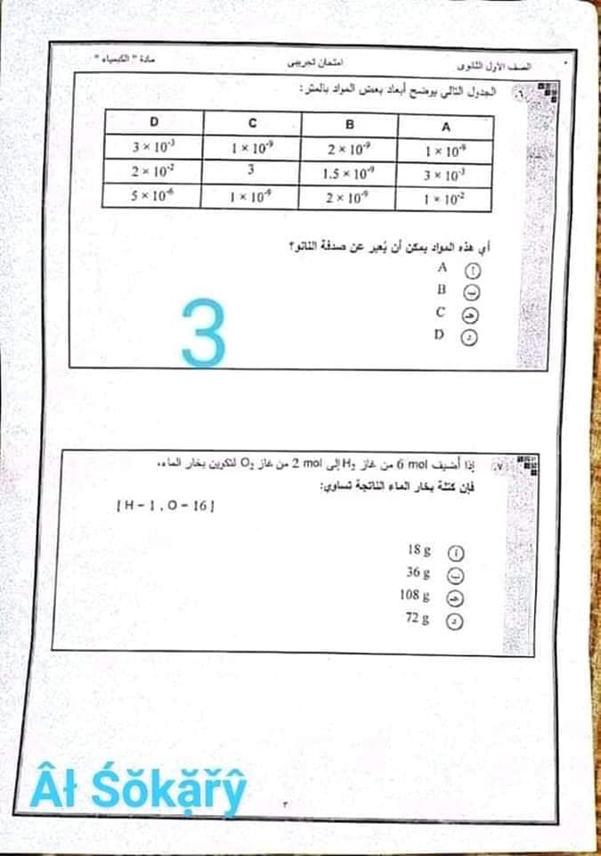 نماذج امتحانات اولى ثانوى النظام الجديد كيمياء