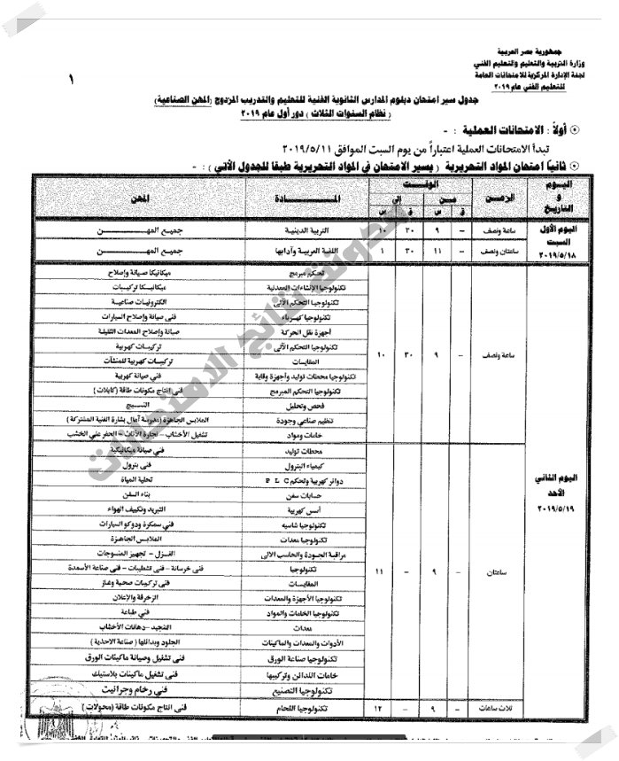 الصناعي جدول امتحانات الدبلومات الفنية 2019